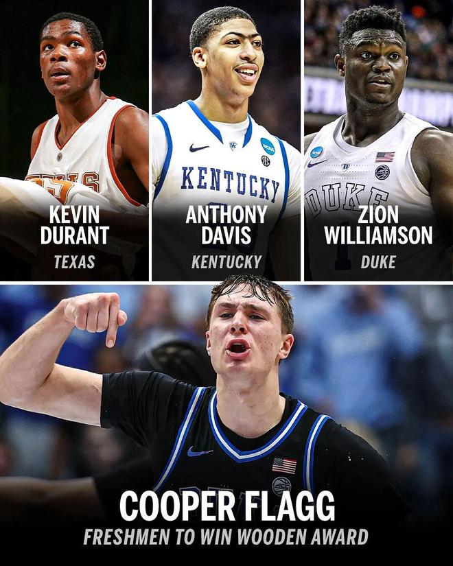 此外,弗拉格还成为历史上第四位获得约翰伍登奖的大一球员,前三位分别是杜兰特、浓眉、锡安,这三位都以高顺位进入NBA,并且都证明了自己不是水货。