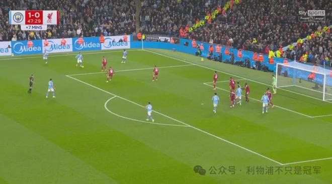 哈兰德进球的时间是28分30秒。在此前1分钟,也就是27分30秒左右,利物浦还在前场逼抢,一度将曼城逼到自己的角球区,但曼城球员通过连续短传配合,轻松瓦解了利物浦的前场逼抢,并很快转入反击。